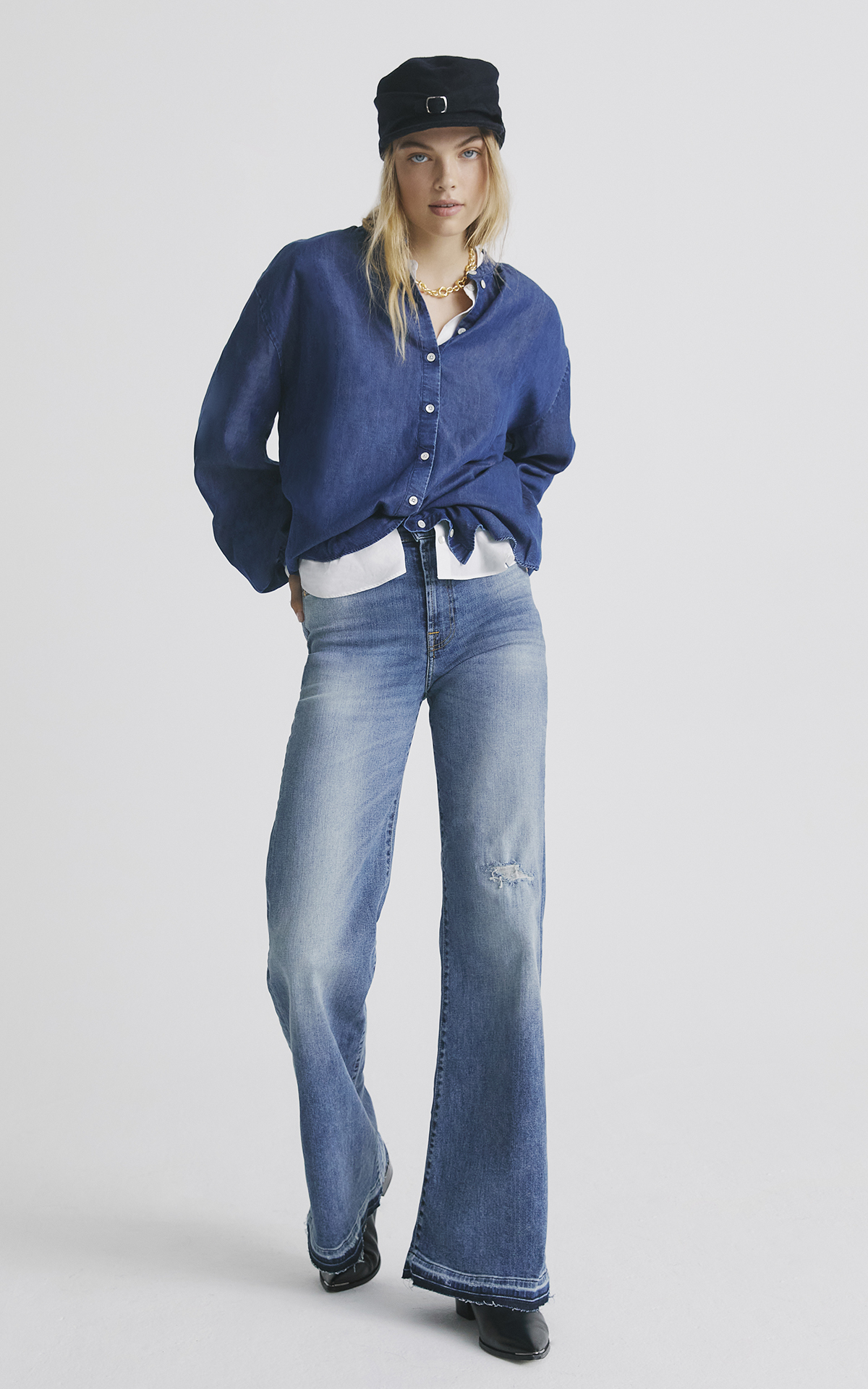 Die Wide Leg Jeans ist die trendige Newcomerin aus den 90ern. Sie begeistert durch den luftig, lockeren Schnitt und sieht mit einem coolen Hemd und Boots besonders cool aus.